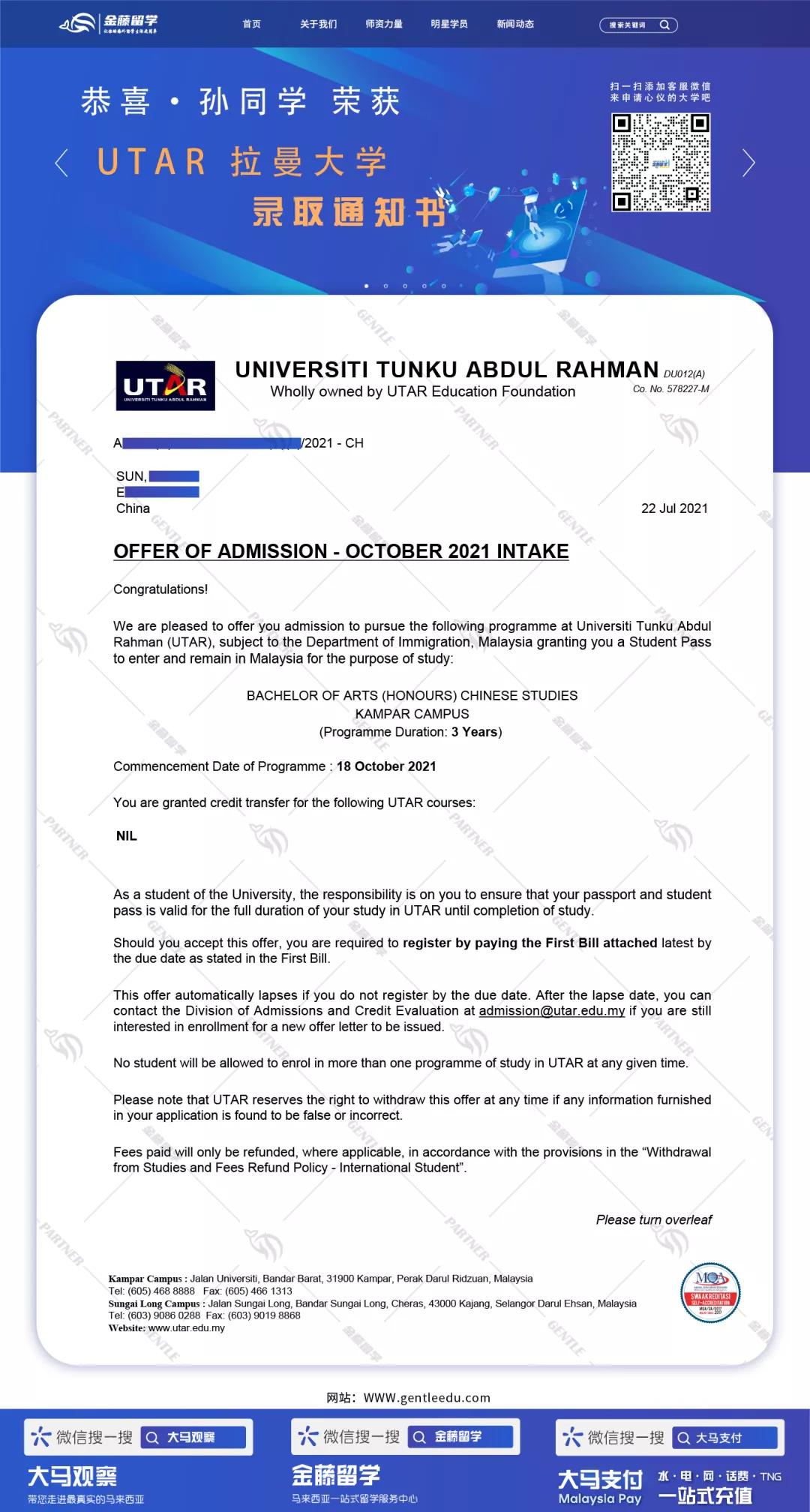 录取情况:UTAR 拉曼大学