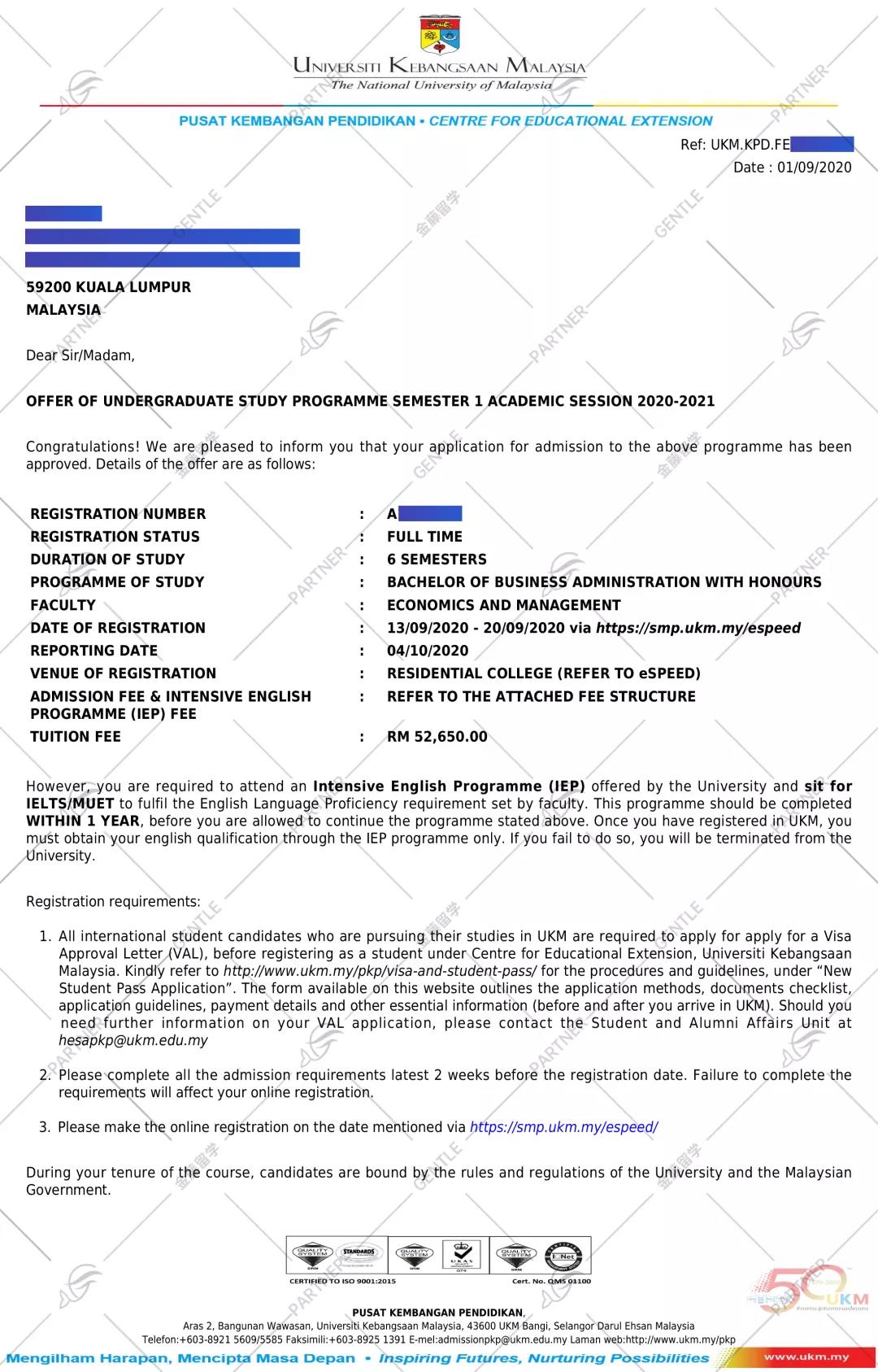 录取情况:马来西亚国立大学工商管理荣誉学位